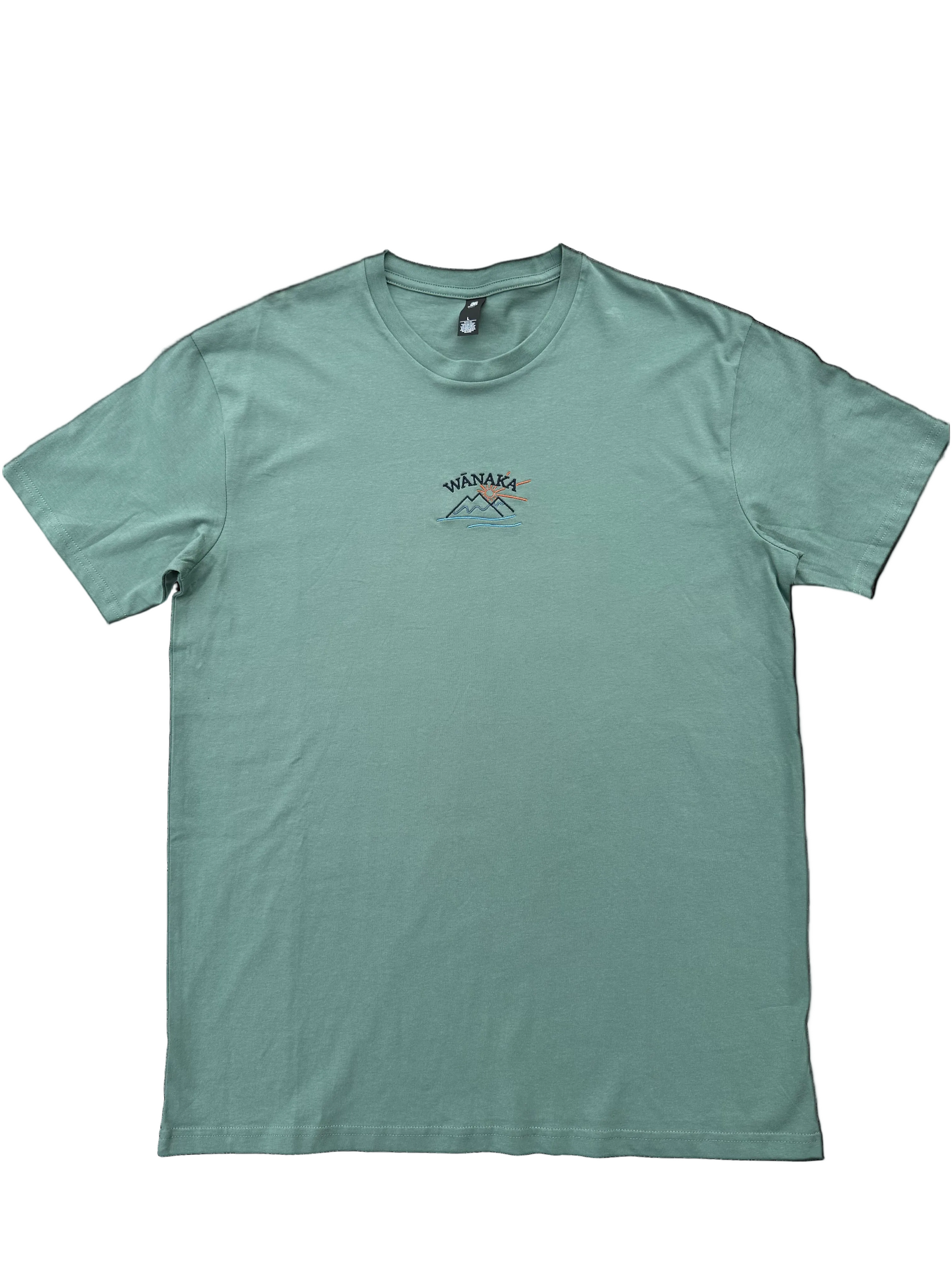 Sage Wānaka T-Shirt – Retro Souvenir Mountain & Lake Embroidery